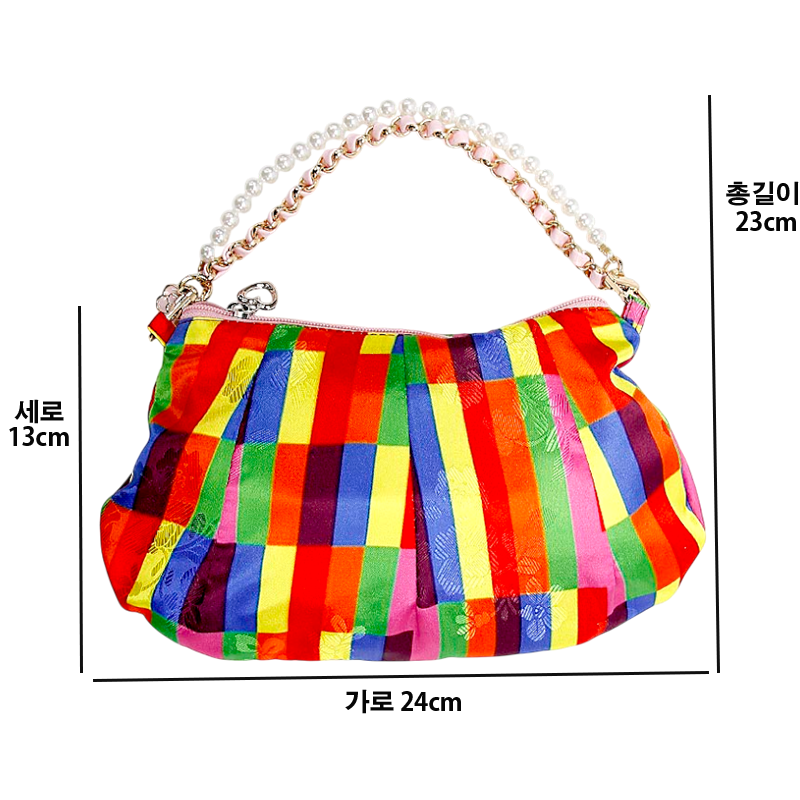 우아한 진주 스트랩과 체인 포인트가 작은 핸드백의 여성스러움과 고급스러움을 살렸습니다.