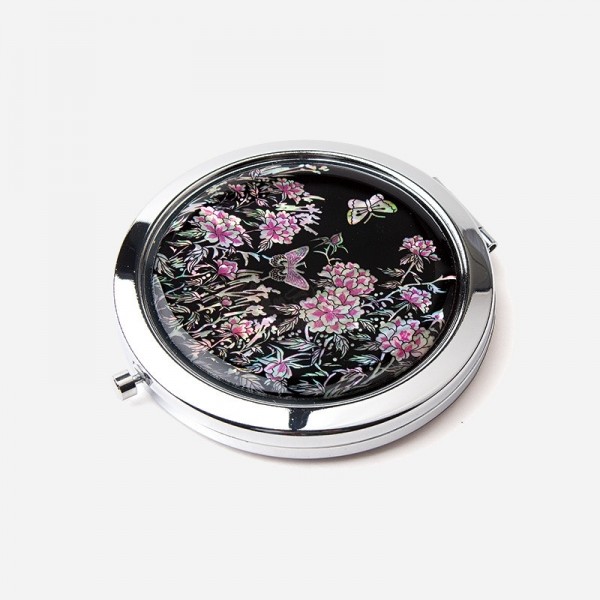 목단의 화려함과 신비롭게 반짝이는 자개가 조화롭게 어우러진 손거울입니다.