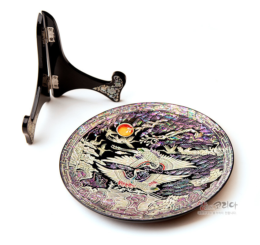 천년의 세월을 이어온 한국 전통 나전칠기 공예 기법으로 제작된 고급 장식 쟁반입니다.